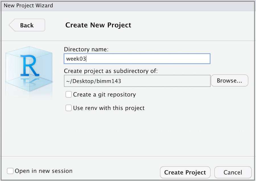 Do this: File > New Project …. then click through the options New Directory > New Project. The directory name you choose here will be the project name. Call it whatever you want (or follow me for convenience Desktop/bimm143/week03). Note here I have an existing folder on my Desktop called bimm143 and I am creating a new Rstudio project called week03. This will be a new folder were all my work will be stored (see image below).